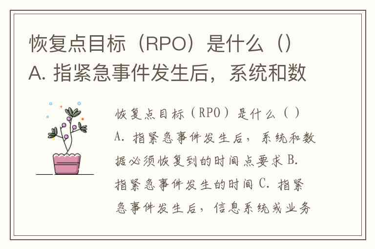 恢复点目标(RPO)是什么() A. 指紧急事件发生后,系统和数据必须恢复到的时间点要求 B. 指紧急事件发生的时间 C. 指紧急事件发生后,信息系统或业务功能从停顿到必须恢复的时间要求。 D. 指系统和数据需要恢复的程度