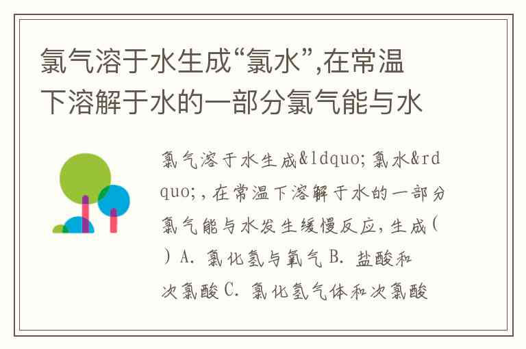 氯气溶于水生成“氯水”,在常温下溶解于水的一部分氯气能与水发生缓慢反应,生成( ) A. 氯化氢与氧气 B. 盐酸和次氯酸 C. 氯化氢气体和次氯酸 D. 次氯酸与氧气