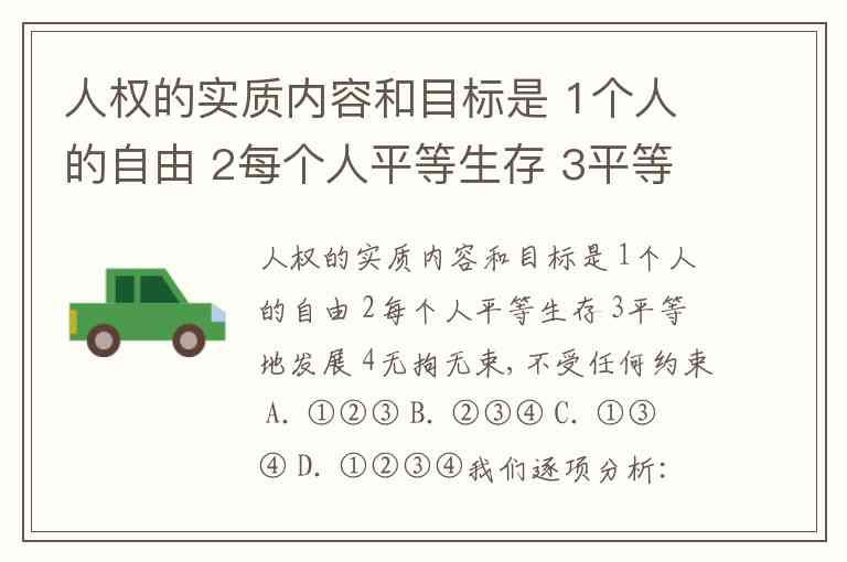 人权的实质内容和目标是 1个人的自由 2每个人平等生存 3平等地发展 4无拘无束,不受任何约束 A. ①②③ B. ②③④ C. ①③④ D. ①②③④
