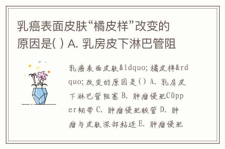 乳癌表面皮肤“橘皮样”改变的原因是( ) A. 乳房皮下淋巴管阻塞 B. 肿瘤侵犯C0pper韧带 C. 肿瘤侵犯较管 D. 肿瘤与皮肤深部粘连 E. 肿瘤侵犯皮下静脉
