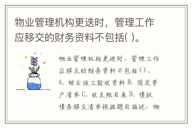 物业管理机构更迭时,管理工作应移交的财务资料不包括( )。 A. 综合竣工验收资料 B. 固定资产清单 C. 收支账目表 D. 债权债务移交清单