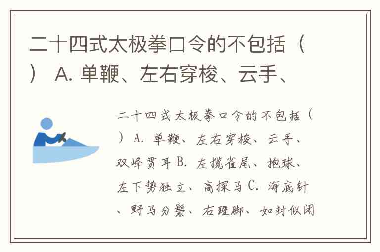 二十四式太极拳口令的不包括() A. 单鞭、左右穿梭、云手、双峰贯耳 B. 左揽雀尾、抱球、左下势独立、高探马 C. 海底针、野马分鬃、右蹬脚、如封似闭 D. 起势、倒转肱、十字手、手挥琵琶