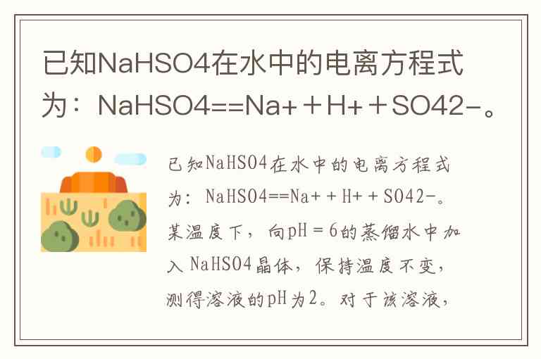NaHSO₄ 完全电离:NaHSO₄ → Na⁺ + H⁺ + SO₄²⁻,因此它相当于加入强酸(H⁺ 来源),使 pH 从 6 降为 2。