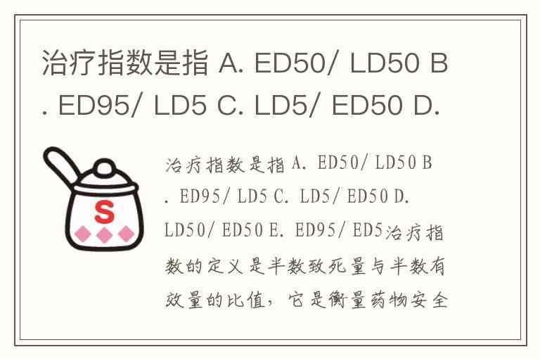 治疗指数是指 A. ED50/ LD50 B. ED95/ LD5 C. LD5/ ED50 D. LD50/ ED50 E. ED95/ ED5