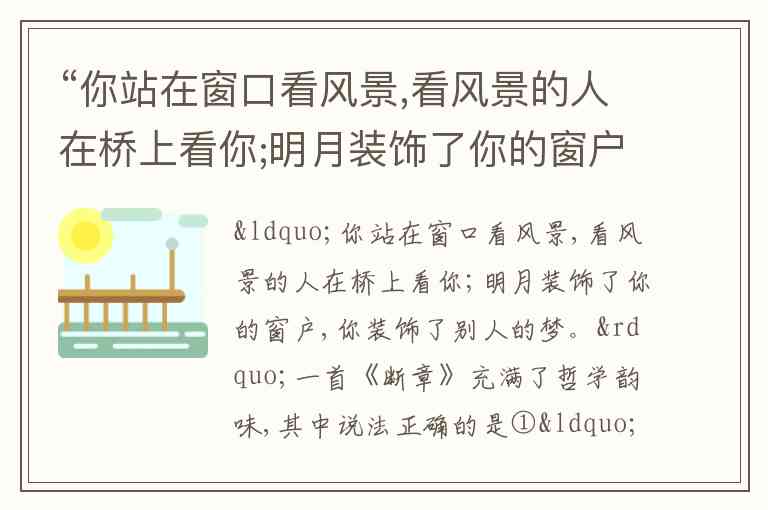 “你站在窗口看风景,看风景的人在桥上看你;明月装饰了你的窗户,你装饰了别人的梦。”一首《断章》充满了哲学韵味,其中说法正确的是①“窗口的风景”是诗人对客观存在的反应 ②“成为别人的风景”是诗人的纯主观想象③“明月装饰风景”体现诗人意识的能动性 ④“装饰别人的梦”说明意识的直接现实性 A. ①② B. ①③ C. ②③ D. ③④
