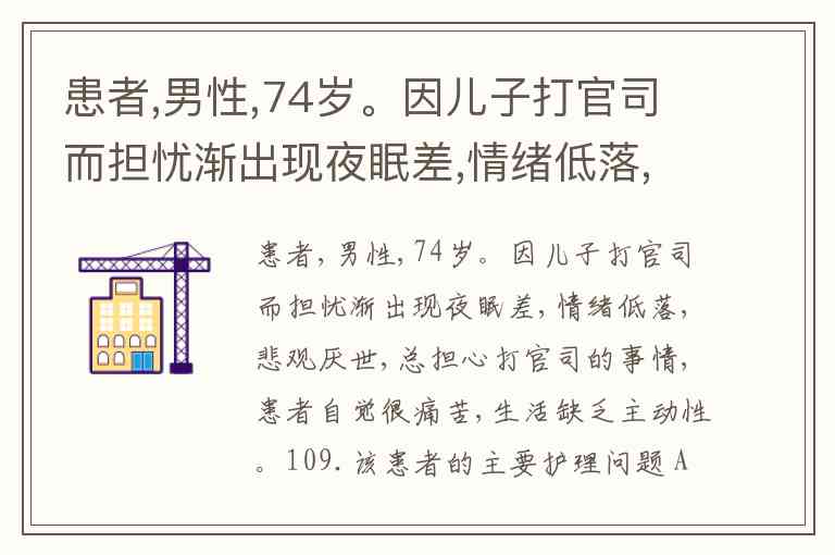 患者,男性,74岁。因儿子打官司而担忧渐出现夜眠差,情绪低落,悲观厌世,总担心打官司的事情,患者自觉很痛苦,生活缺乏主动性。109.该患者的主要护理问题 A. 不合作 B. 睡眠障碍 C. 自杀的危险 D. 舒适的改变 E. 有暴力行为的危险