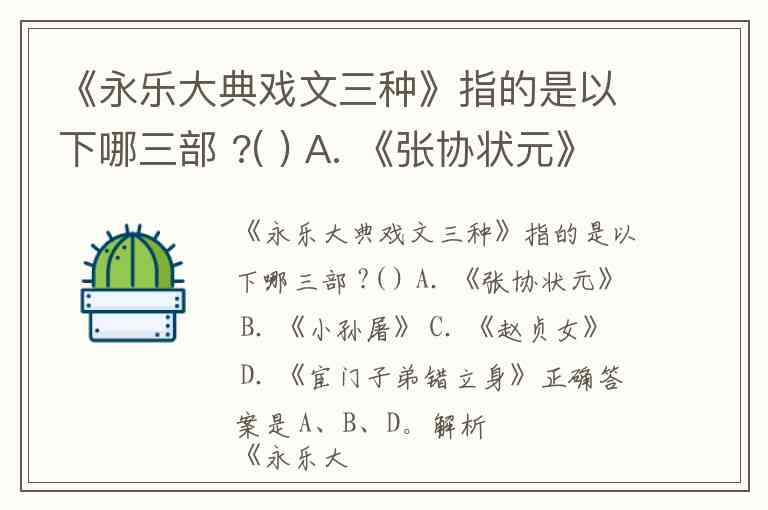 解析《永乐大典戏文三种》是指明代《永乐大典》中收录的三种早期南戏剧本,现存于《永乐大典》第13991卷。这三种戏文包括: