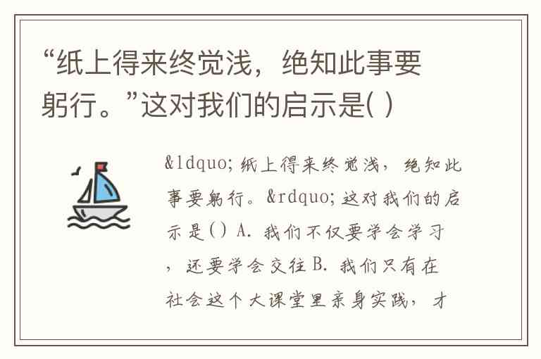 “纸上得来终觉浅,绝知此事要躬行。”这对我们的启示是( ) A. 我们不仅要学会学习,还要学会交往 B. 我们只有在社会这个大课堂里亲身实践,才能更好地发展自己 C. 社会发展对个人素质提出了新要求 D. 纸上学到的东西没有用,要想有所收获必须参加社会实践