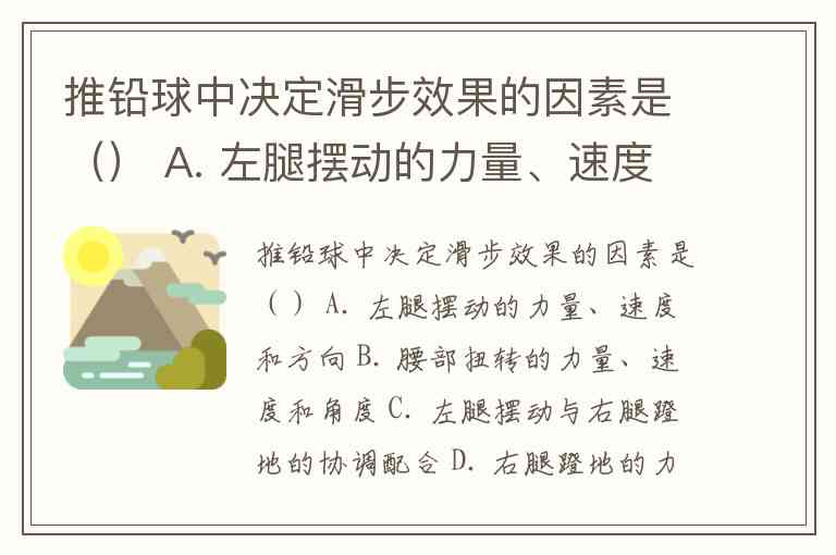 推铅球中决定滑步效果的因素是() A. 左腿摆动的力量、速度和方向 B. 腰部扭转的力量、速度和角度 C. 左腿摆动与右腿蹬地的协调配合 D. 右腿蹬地的力量、速度和角度