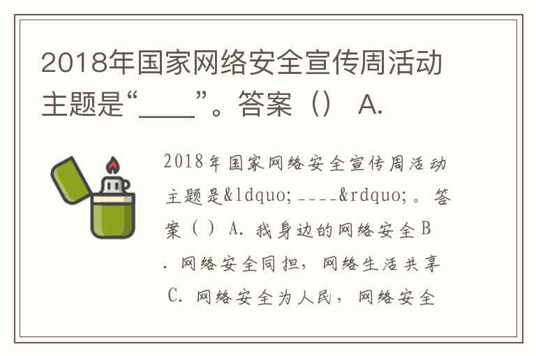 2018年国家网络安全宣传周活动主题是“____”。答案() A. 我身边的网络安全 B. 网络安全同担,网络生活共享 C. 网络安全为人民,网络安全靠人民 D. 共建网络安全,共享网络文明
