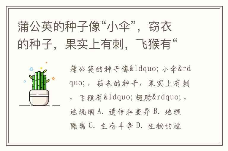 蒲公英的种子像“小伞”,窃衣的种子,果实上有刺,飞猴有“翅膀”,这说明 A. 遗传和变异 B. 地理隔离 C. 生存斗争 D. 生物的适应性