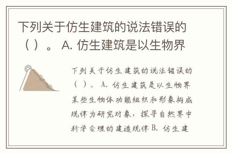 下列关于仿生建筑的说法错误的( )。 A. 仿生建筑是以生物界某些生物体功能组织和形象构成规律为研究对象,探寻自然界中科学合理的建造规律 B. 仿生建筑已成为一种新时代潮流,也是建筑文化的新课题 C. 仿生是最具有生命力的创作形式,也是可持续发展的保证 D. 利用系统集成方法,将智能型计算机技术和现代建筑艺术等有机结合