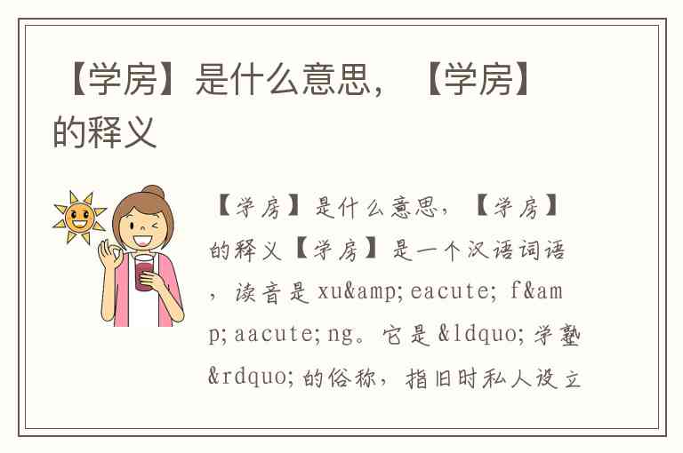 【学房】是一个汉语词语,读音是 xué fáng。它是 “学塾”的俗称,指旧时私人设立的学堂,也就是我们现在常说的 “私塾” -1-2-5。