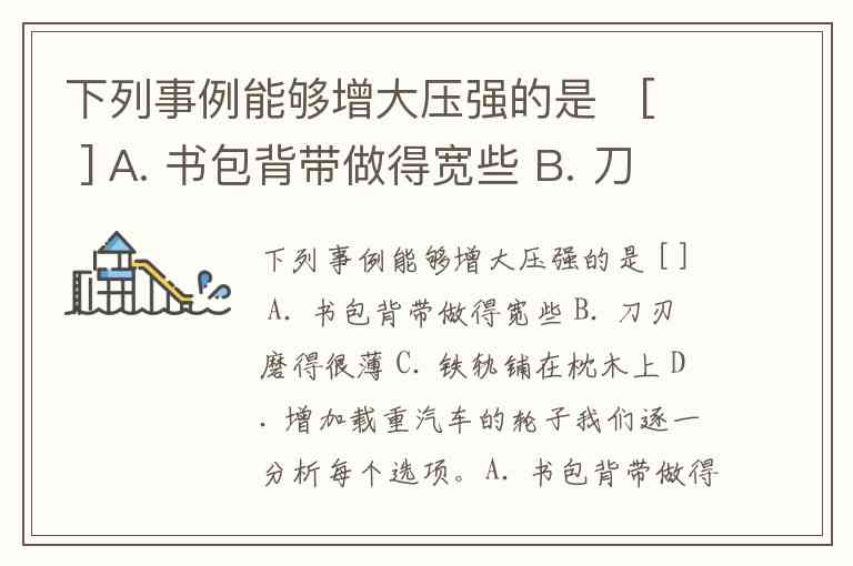 下列事例能够增大压强的是 [ ] A. 书包背带做得宽些 B. 刀刃磨得很薄 C. 铁轨铺在枕木上 D. 增加载重汽车的轮子
