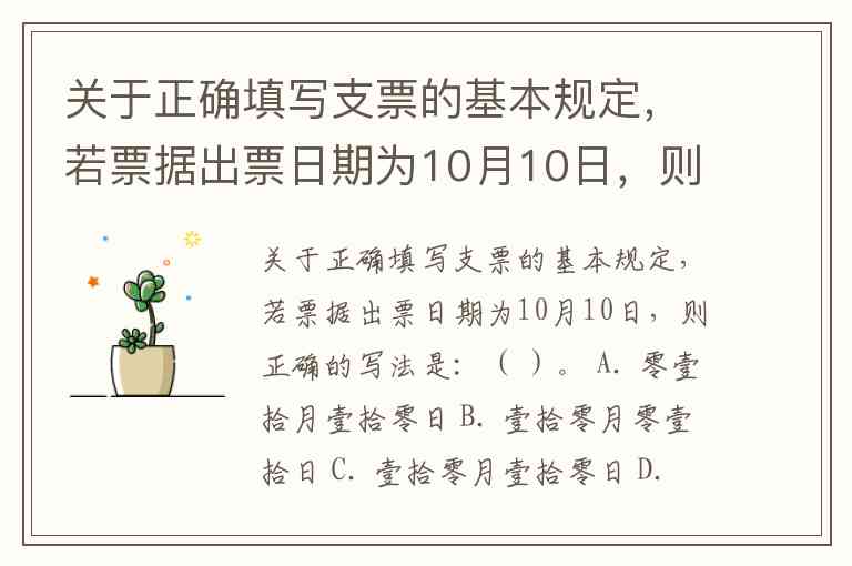 关于正确填写支票的基本规定,若票据出票日期为10月10日,则正确的写法是:( )。 A. 零壹拾月壹拾零日 B. 壹拾零月零壹拾日 C. 壹拾零月壹拾零日 D. 零壹拾月零壹拾日