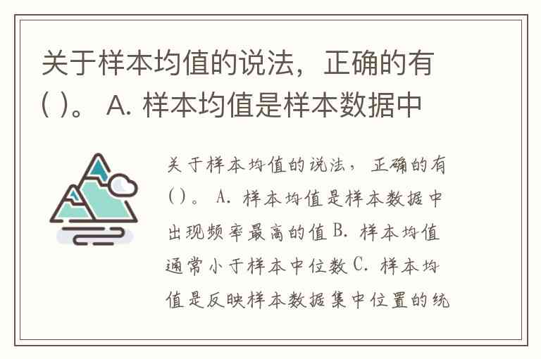 关于样本均值的说法,正确的有( )。 A. 样本均值是样本数据中出现频率最高的值 B. 样本均值通常小于样本中位数 C. 样本均值是反映样本数据集中位置的统计量 D. 样本均值不易受样本数据中极端值的影响 E. 样本均值是总体均值的无偏估计量
