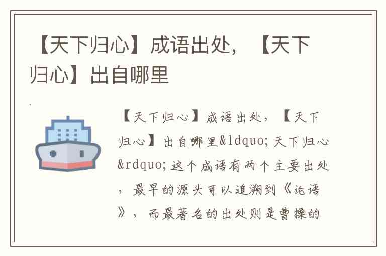 “天下归心”这个成语有两个主要出处,最早的源头可以追溯到《论语》,而最著名的出处则是曹操的《短歌行》。