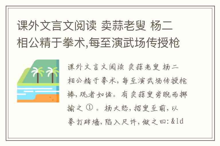 课外文言文阅读 卖蒜老叟 杨二相公精于拳术,每至演武场传授枪棒,观者如堵。有卖蒜叟旁睨而揶揄之 ① 。杨大怒,招叟至前,以拳打砖墙,陷入尺许,做之曰:“叟能如是乎?”叟曰:“君能打墙,不能打人。”杨骂曰:“老奴能受我打乎?打死勿怨!”叟自缚于树,解衣露腹。杨故取势于十步外,奋拳击之。老人寂然无声,但见杨双膝跪地,叩头曰:“晚生知罪矣。”提其拳,已夹入老人腹中,坚不可出。 ——节选自清 袁枚《子不语·卷十四·卖蒜叟》 [注释]①睨:龊睛斜着看。揶揄:出言嘲笑、讽刺。 (1)下列句中“之”字用法与其它不同的一句是( ) A. 睨之久而不去 B. 但微颔之 C. 有卖蒜叟旁睨而揶揄之 D. 奋拳击之