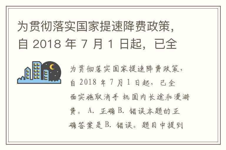 为贯彻落实国家提速降费政策,自 2018 年 7 月 1 日起,已全面实施取消手 机国内长途和漫游费。 A. 正确 B. 错误