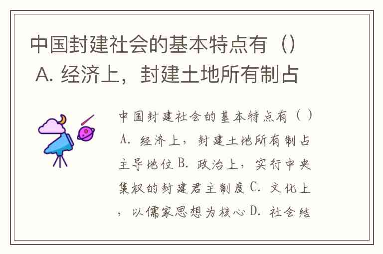 中国封建社会的基本特点有() A. 经济上,封建土地所有制占主导地位 B. 政治上,实行中央集权的封建君主制度 C. 文化上,以儒家思想为核心 D. 社会结构上,是族权和政权相结合的封建宗法等级制度