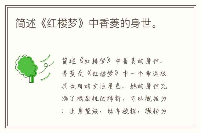 香菱是《红楼梦》中一个命运极其坎坷的女性角色。她的身世充满了戏剧性的转折,可以概括为:出身望族,幼年被拐,辗转为人妾,最终惨死。