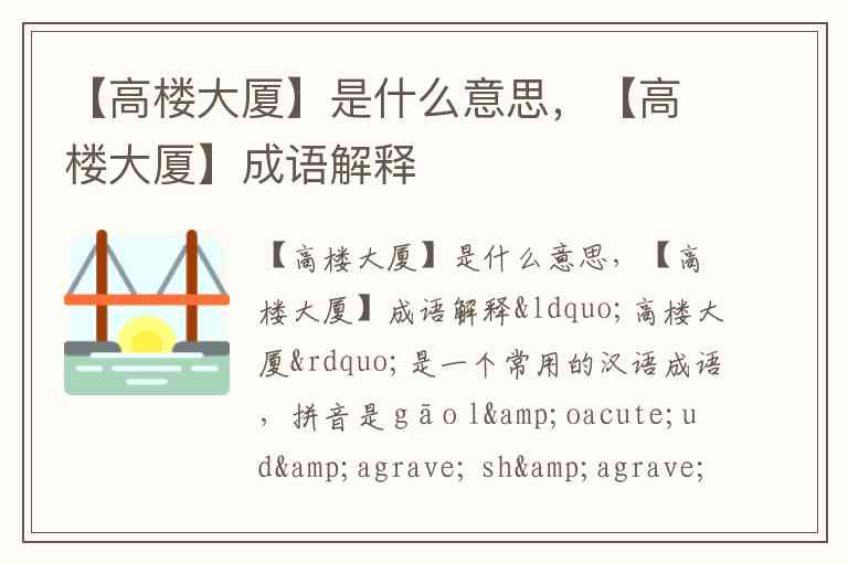 “高楼大厦”是一个常用的汉语成语,拼音是 gāo lóu dà shà,字面意思和实际含义都是指高耸的、宽大的楼房,泛指高层建筑-3-5。