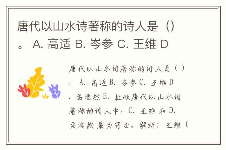 孟浩然(D):唐代第一位大量创作山水诗的诗人,与王维并称“王孟”,专攻山水田园题材。