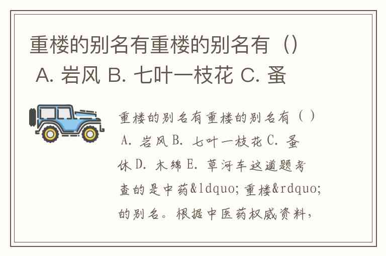 重楼的别名有重楼的别名有() A. 岩风 B. 七叶一枝花 C. 蚤休 D. 木绵 E. 草河车