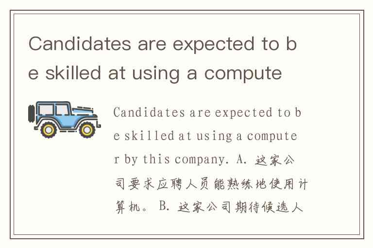 Candidates are expected to be skilled at using a computer by this company. A. 这家公司要求应聘人员能熟练地使用计算机。 B. 这家公司期待候选人能具备使用计算机的技能。 C. 应聘人员被这家公司聘为熟练的计算机操作员。 D. 这家公司期待能熟练地使用计算机的候选人。