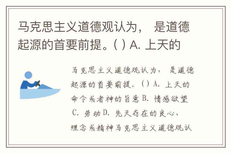 马克思主义道德观认为, 是道德起源的首要前提。( ) A. 上天的命令或者神的旨意 B. 情感欲望 C. 劳动 D. 先天存在的良心、理念或精神