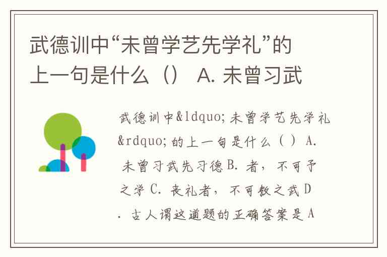 值得一提的是,在一些正式的《武德训》文本中,这句话前还有“古人谓”三字作为引语,即“古人谓:未曾学艺先学礼,未曾习武先习德” -3-4-5。不过,就这道题所问的与“未曾学艺先学礼”直接相接的上一句而言,正是选项A。
