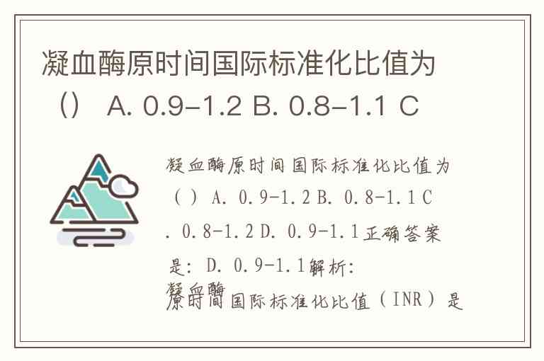凝血酶原时间国际标准化比值为() A. 0.9-1.2 B. 0.8-1.1 C. 0.8-1.2 D. 0.9-1.1