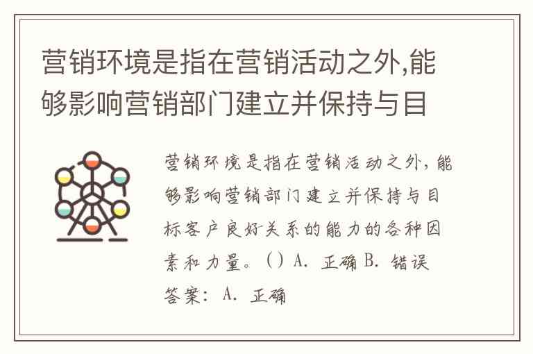 营销环境是指在营销活动之外,能够影响营销部门建立并保持与目标客户良好关系的能力的各种因素和力量。( ) A. 正确 B. 错误