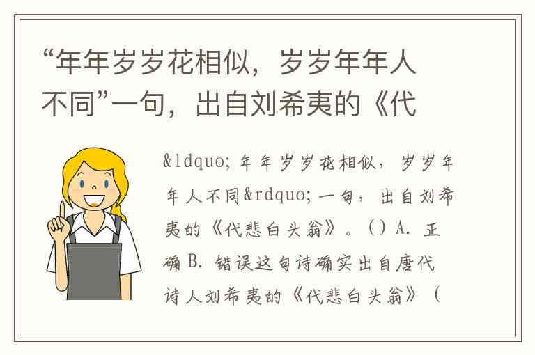 “年年岁岁花相似,岁岁年年人不同”一句,出自刘希夷的《代悲白头翁》。( ) A. 正确 B. 错误