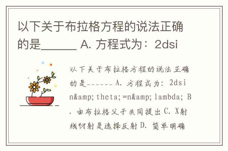 以下关于布拉格方程的说法正确的是______ A. 方程式为:2dsinθ=nλ B. 由布拉格父子共同提出 C. X射线衍射是选择反射 D. 简单明确地指出获得X衍射的必要条件和衍射方向
