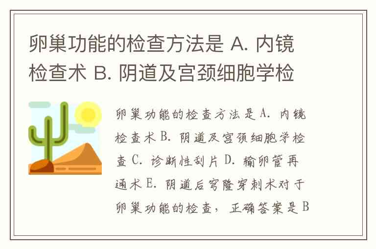 卵巢功能的检查方法是 A. 内镜检查术 B. 阴道及宫颈细胞学检查 C. 诊断性刮片 D. 输卵管再通术 E. 阴道后穹隆穿刺术