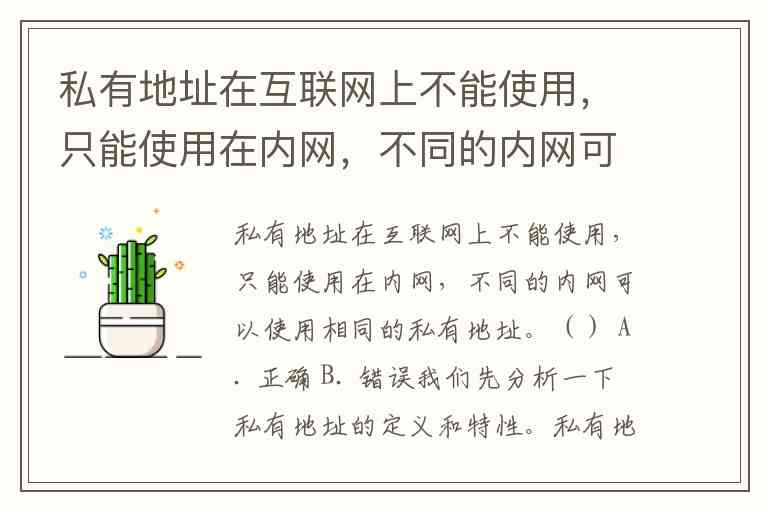 私有地址在互联网上不能使用,只能使用在内网,不同的内网可以使用相同的私有地址。() A. 正确 B. 错误