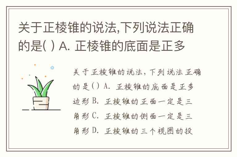 关于正棱锥的说法,下列说法正确的是( ) A. 正棱锥的底面是正多边形 B. 正棱锥的正面一定是三角形 C. 正棱锥的侧面一定是三角形 D. 正棱锥的三个视图的投影一定具有对称中心线