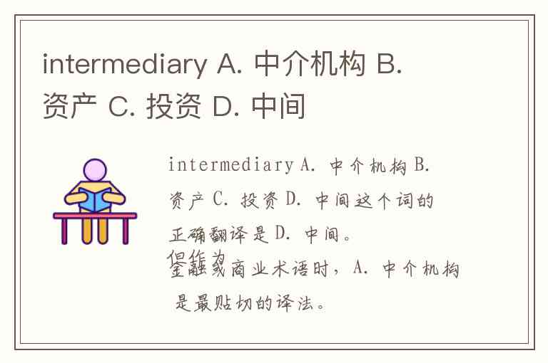 intermediary A. 中介机构 B. 资产 C. 投资 D. 中间