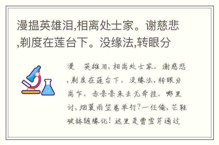 漫揾英雄泪,相离处士家。谢慈悲,剃度在莲台下。没缘法,转眼分离乍。赤条条来去无牵挂。哪里讨,烟蓑雨笠卷单行?一任俺,芒鞋破钵随缘化! 这里是曹雪芹通过薛宝钗的赞美,从鲁智深的一生中, 从其 醉闹五台山、赤条条来去无牵挂的痛快与决绝中,读出来禅的顿悟,也同时感受到他的侠的豪情。 A. 正确 B. 错误