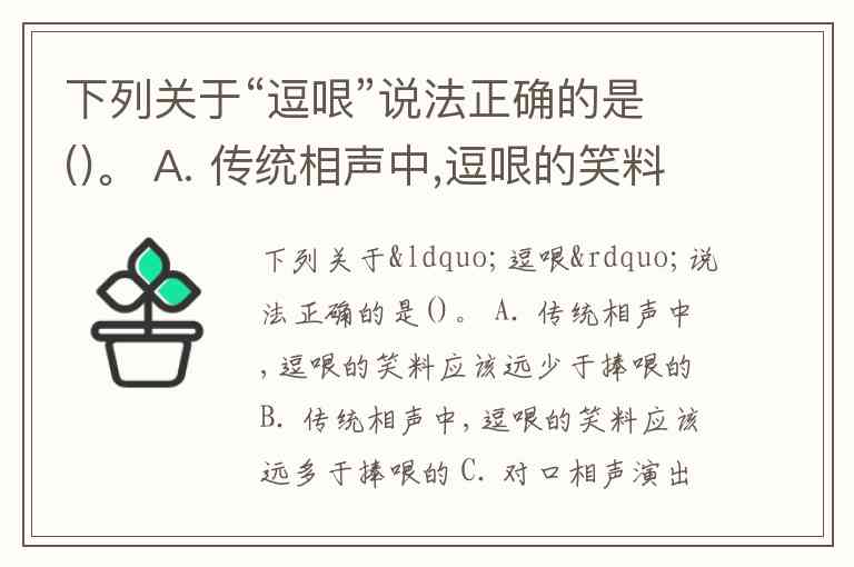 这两个选项是关于笑料多少的,其中B选项的说法是正确的,但题目可能将其设置为干扰项。不过更严谨的说法是,在传统相声中,逗哏的笑料通常远多于捧哏。逗哏是主要的叙述者和笑料制造者,捧哏则负责通过衬托、铺垫来帮助逗哏组成“包袱”,从而产生笑料-2-5-8。所以B是正确描述,但C和D是更核心的定义,在多选题中C和D是必须选的。