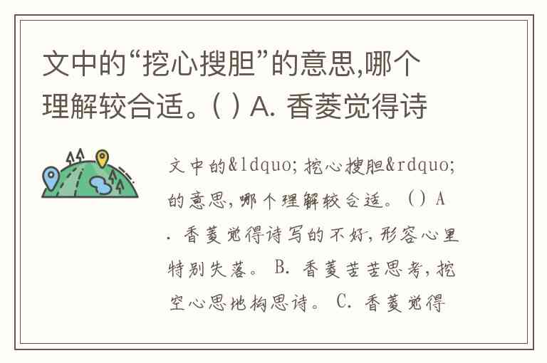 文中的“挖心搜胆”的意思,哪个理解较合适。( ) A. 香菱觉得诗写的不好,形容心里特别失落。 B. 香菱苦苦思考,挖空心思地构思诗。 C. 香菱觉得诗写的不好,形容心里特别痛苦。 D. 香菱费尽心思思考诗,注意力特别专注。