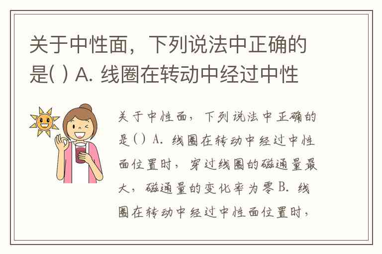 线圈在中性面时,磁感线垂直于线圈平面穿过,磁通量最大,但磁通量的变化率(即瞬时电动势)为零(因为此时速度方向与磁感线平行,切割速度为 0)。