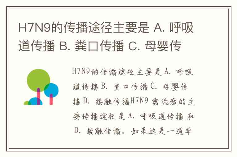 H7N9的传播途径主要是 A. 呼吸道传播 B. 粪口传播 C. 母婴传播 D. 接触传播