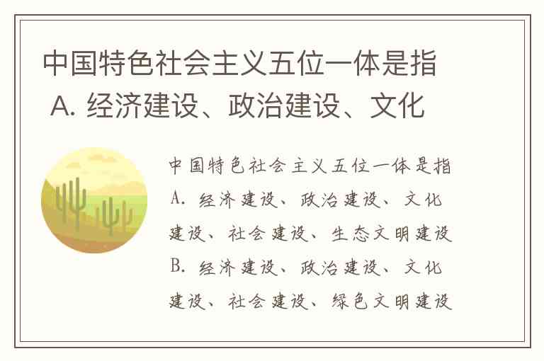 中国特色社会主义五位一体是指 A. 经济建设、政治建设、文化建设、社会建设、生态文明建设 B. 经济建设、政治建设、文化建设、社会建设、绿色文明建设 C. 经济建设、政治建设、文化建设、社会建设、精神文明建设 D. 经济建设、政治建设、文化建设、社会建设、廉洁文明建设