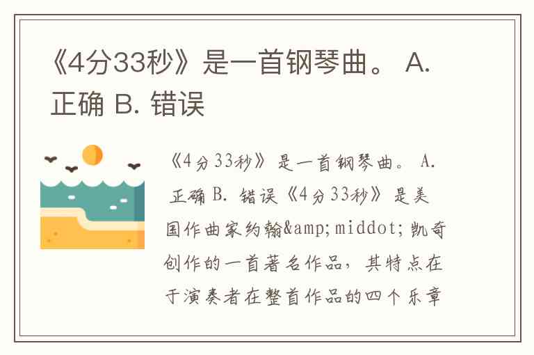 《4分33秒》是一首钢琴曲。 A. 正确 B. 错误