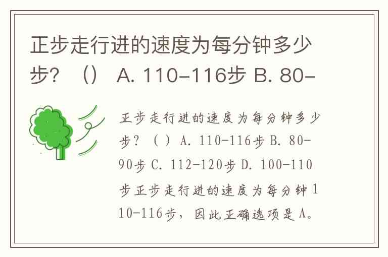 科普与百科佐证:人民网在科普步行健康的文章中提到,正步走的速度是每分钟110步到116步-2-3。百度知道上的多个回答和百科类网站也确认了这一标准-9-10。