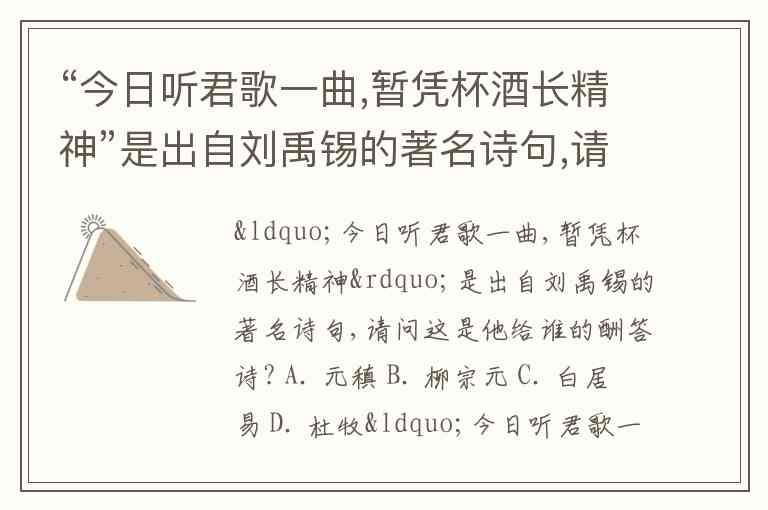 “今日听君歌一曲,暂凭杯酒长精神”是出自刘禹锡的著名诗句,请问这是他给谁的酬答诗? A. 元稹 B. 柳宗元 C. 白居易 D. 杜牧