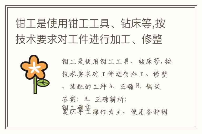 钳工是使用钳工工具、钻床等,按技术要求对工件进行加工、修整、装配的工种 A. 正确 B. 错误
