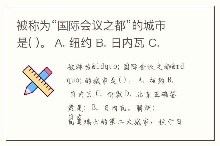 被称为“国际会议之都”的城市是( )。 A. 纽约 B. 日内瓦 C. 伦敦 D. 北京